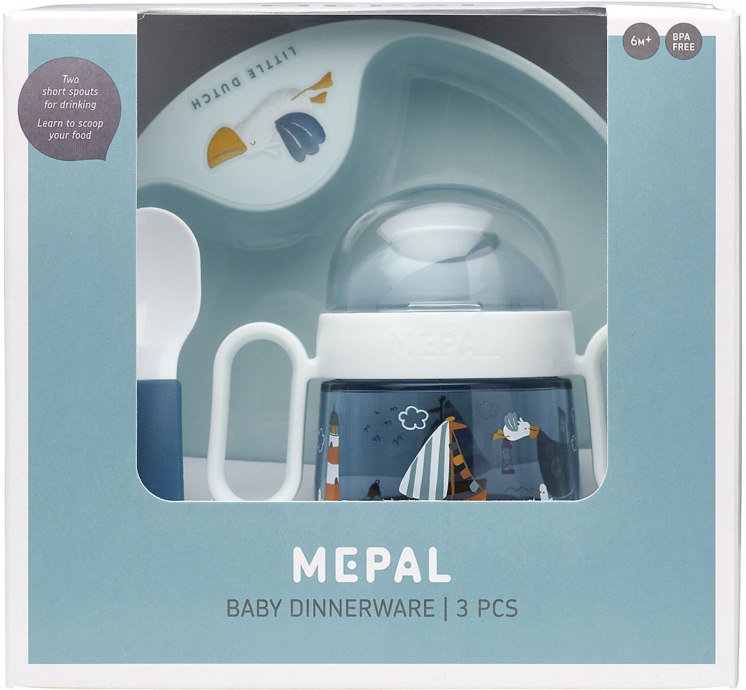 Setul de masă pentru copii Mepal Little Dutch – Sailors Bay, format din trei piese, este special creat pentru a susține primele mese independente ale celor mici. Decorat cu motive vesele inspirate de lumea marină, setul este ușor de manevrat și perfect adaptat mâinilor copiilor.