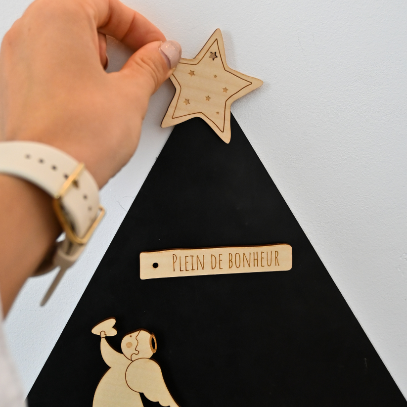 19 forme magnetice din lemn de arțar* provenit din păduri gestionate responsabil: globuri, îngerași, brazi, porumbel, stele, inimă, cuvinte de iubire și multe altele – grosime 3 mm.