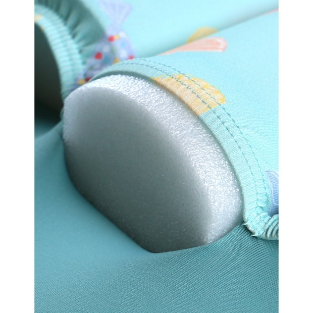 Costumul de baie flotant albastru deschis si galben cu imprimeu estival si bretele incrucisate pe spate este special conceput pentru a insoti primele miscari ale micutului tau in apa. Copilul dumneavoastra trebuie sa ramana Inntotdeauna sub supravegherea constanta a unui adult cand se joaca Inn apa.