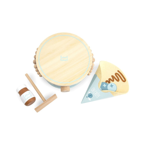 Setul include tot ce ai nevoie pentru joaca de-a bucătarul: 1 aparat de făcut clătite, 1 clătită cu topping, 1 ambalaj, fructe/frișcă, 1 borcan cu ciocolată și 1 spatulă din lemn.
