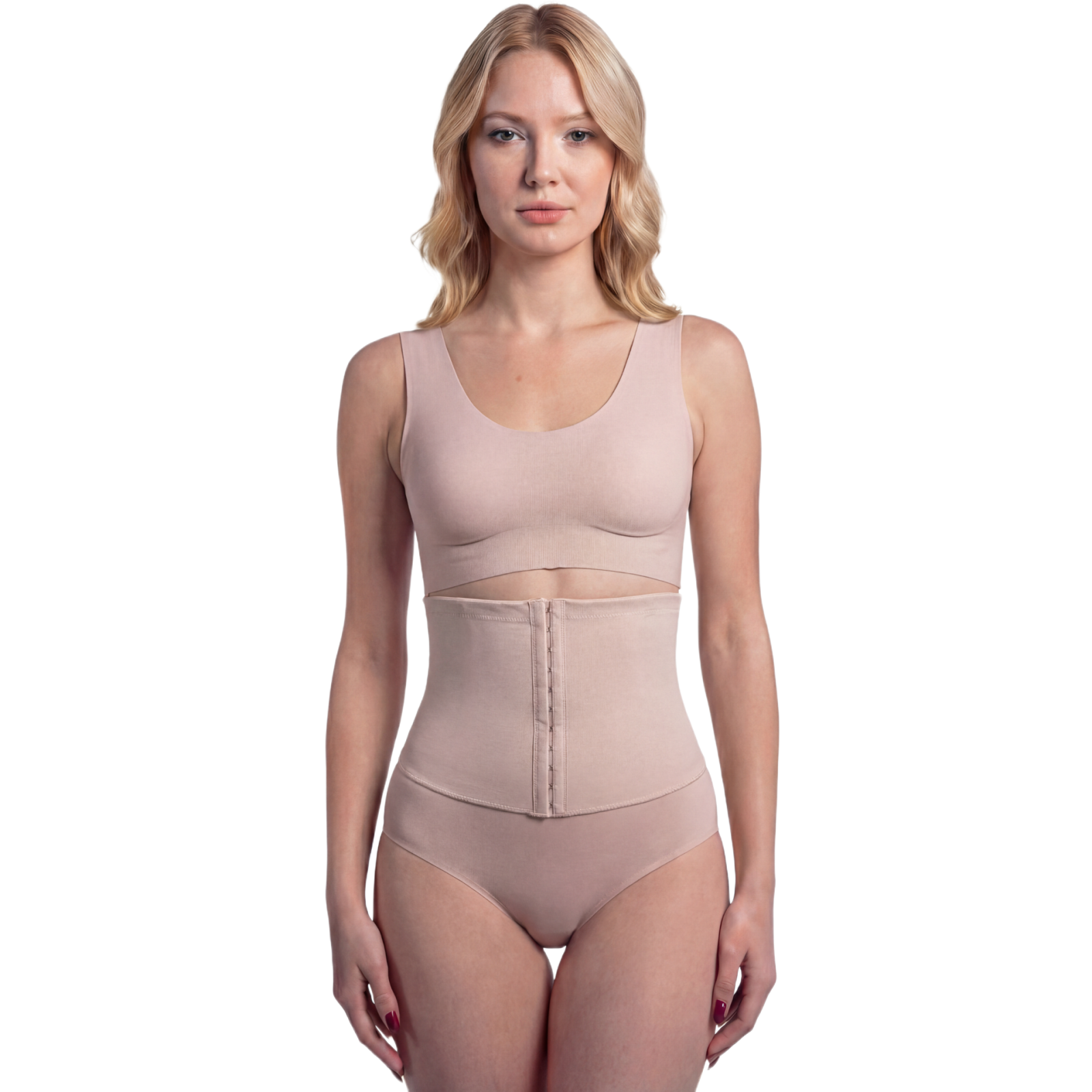 Confecționată dintr-un material compresiv de înaltă calitate, lenjeria asigură o presiune controlată și uniformă asupra abdomenului, taliei și zonei lombare. Compresia direcționată ajută la diminuarea senzației de umflare și tensiune abdominală, oferind în același timp suport musculaturii afectate de sarcină și intervenția chirurgicală.